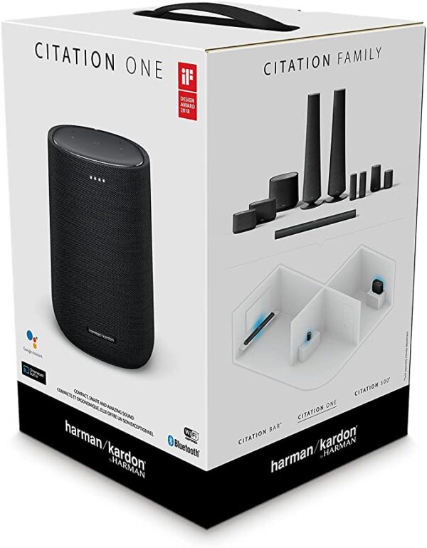 Enjoy voice control and Bluetooth audio streaming with the black Harman Kardon Citation ONE Wireless Speaker. Dual-band Wi-Fi allows you to stream and cast from numerous music sources, and built-in Bluetooth technology allows you to pair and wirelessly stream music from your compatible devices, such as smartphones or tablets. This speaker has the Google Assistant built-in, allowing it to be controlled using just your voice with its built-in microphone system, which can be disabled for privacy. The Citation ONE outputs up to 40W of power from its 0.79″ tweeter and 3.5″ woofer.