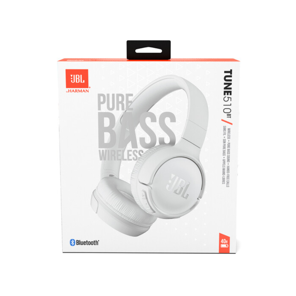 The JBL Tune 510BT (White) headphones let you stream powerful JBL Pure Bass sound with no strings attached. Easy to use, these headphones provide up to 40 hours of pure pleasure and an extra 2 hours of battery with just 5 minutes of power with the USB-C charging cable. And if a call comes in while you are watching a video on another device, the JBL Tune 510BT seamlessly switches to your mobile.