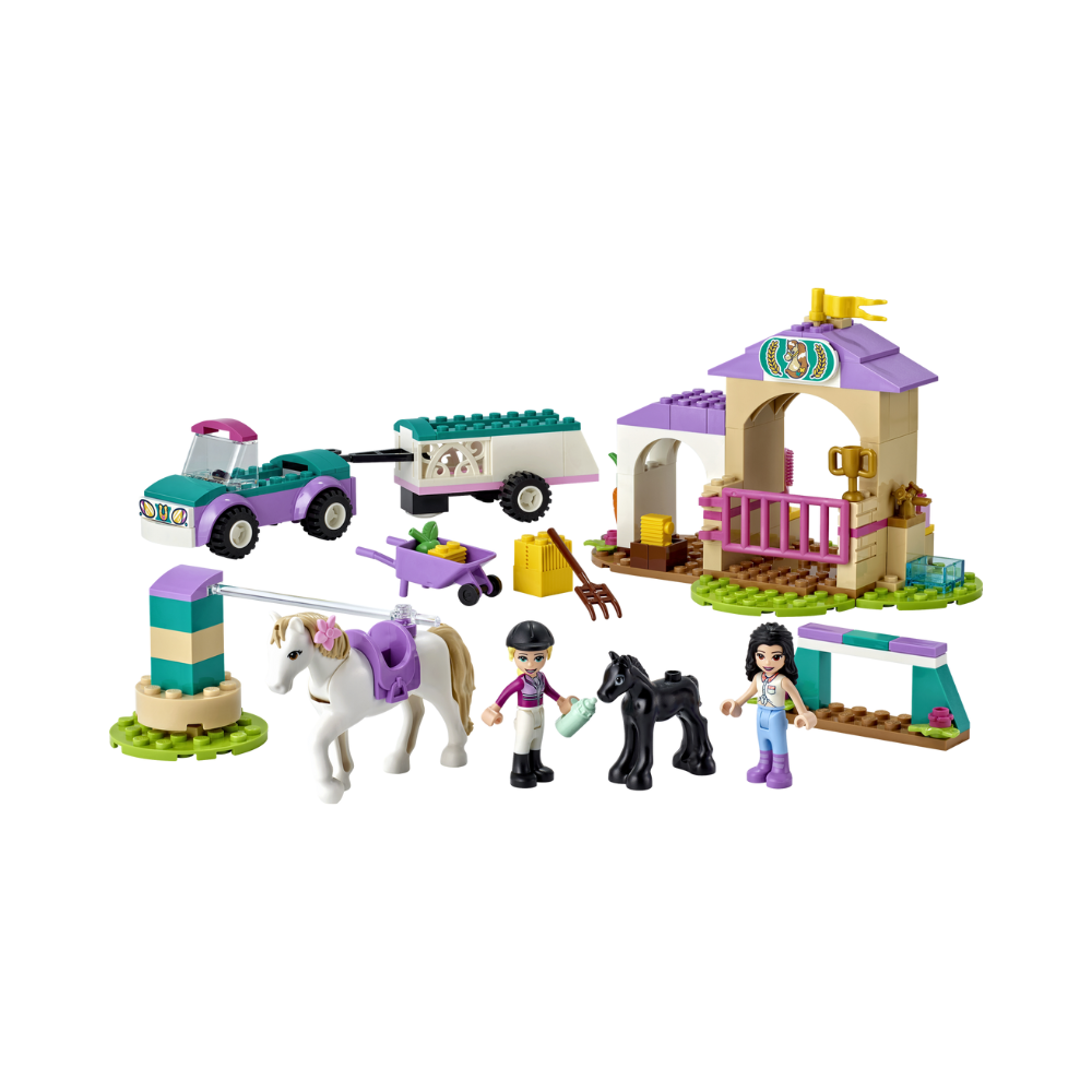 - Playset includes a car for the LEGO Friends to drive, a trailer for the horse, a stable with grooming kit, jumps and a training rein kids can use to teach the horse to walk around the ground.