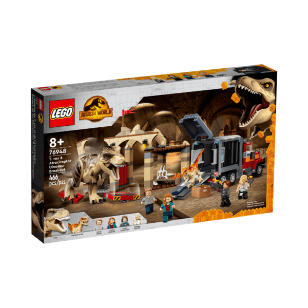 Fans can reimagine thrilling action from the Jurassic World Dominion movie with this T. rex & Atrociraptor Dinosaur Breakout (76948) toy playset. An awesome gift for trendsetting kids aged 8 and up, it features a buildable market and big rig truck toy, plus Atrociraptor and T. rex figures. The market has a T. rex enclosure with a breakout function, and the truck has room for 2 Atrociraptors (Find another Atrociraptor in the 76945 set).