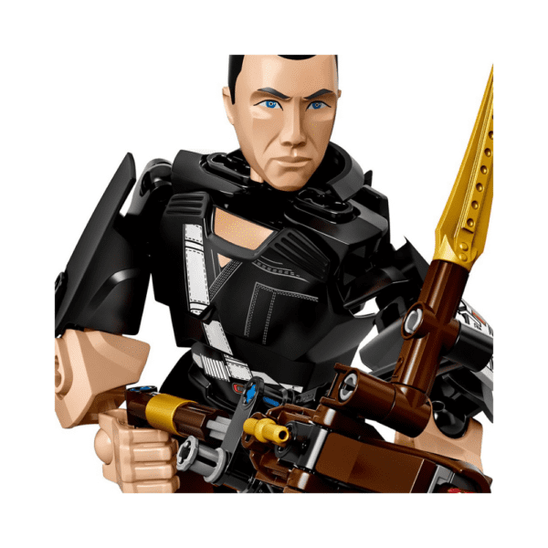 - Buildable and highly posable Chirrut Îmwe figure features a folding bowcaster with spring-loaded shooter, textile tunic, decorated elements and spare ammo mounted on his back.