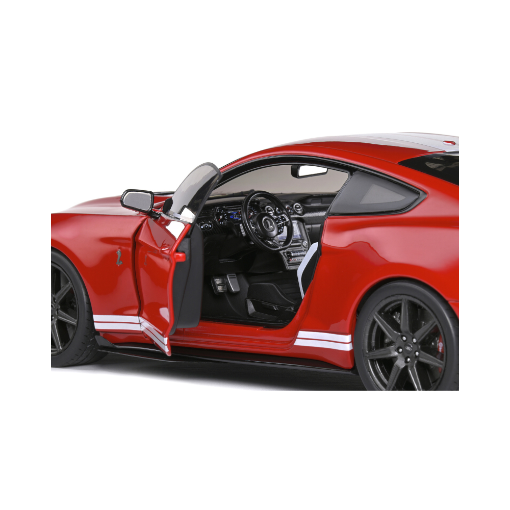 The Sixth Generation Mustang has seduced drivers around the world since 2015. The Phase 2 was marketed from 2018 and the sports version arrived the following year, still under the name GT500. With its red livery and white stripes, it is a tribute to the first Mustangs! This Fast Track Edition is the sportiest version with a specific spoiler and no rear seat.